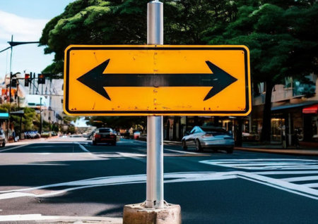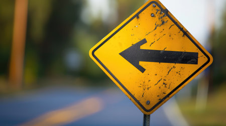 High-quality photo of a caution yellow road sign with a black arrow