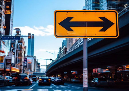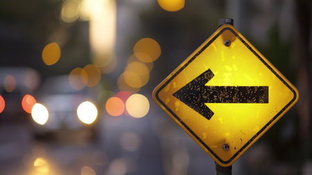 A striking image featuring a yellow arrow left sign on a road, set against a blurred city skyline at dusk, with vibrant traffic light trails illuminating the scene.