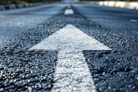 A close-up view of a white arrow painted on an asphalt road, symbolizing direction and guidance. The image captures a serene outdoor setting, inviting exploration.