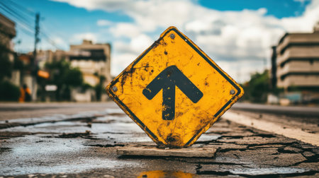 Yellow arrow on asphalt road symbolizes growth and success guiding way forward with clear symbols of direction and progress in urban setting.