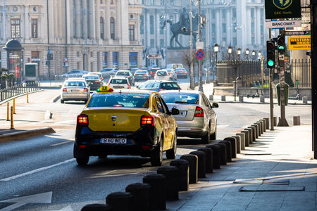 Car traffic at rush hour in downtown area, Victoriei Boulevard (Calea Victoriei) in Bucharest, Romania, 2019