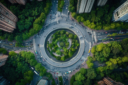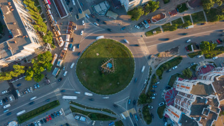 top view of a roundabout in the middle of a busy city. aerial view centered symmetrical.