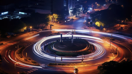 Captivating aerial shot of a vibrant city roundabout illuminated at night, showcasing bustling traffic and colorful lights in a dynamic urban atmosphere.