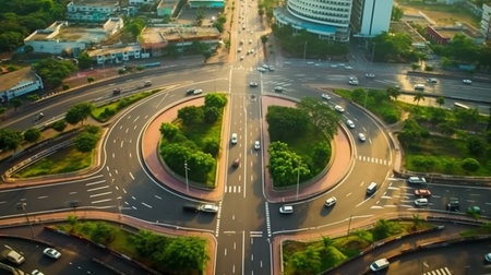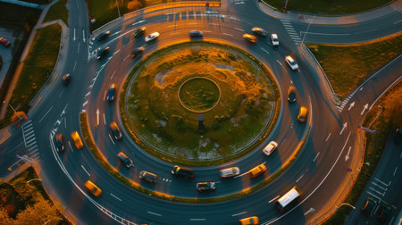 Aerial view of busy multilane highways with cars navigating roundabouts showcasing everyday urban traffic. Concept Urban Traffic, Multilane Highways, Aerial View, Roundabouts, Busy Cars