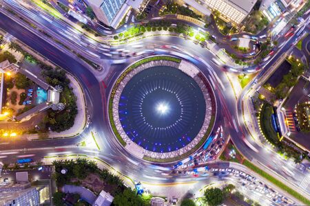 aerial image of a circle roundabout road in an Asian metropolis carrying traffic. aerial drone view flying in a circle at a high angle. commuting city life as an economic and energetic idea