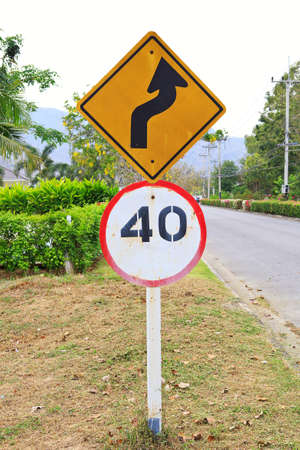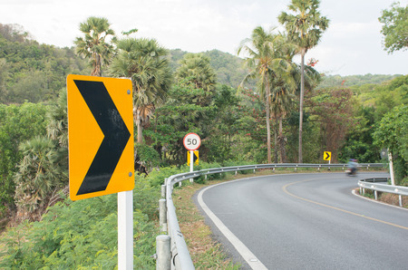 Curve road and right turning signal and Speed limit signs on the way down hill,AF Focused