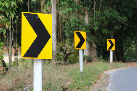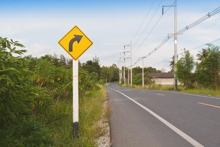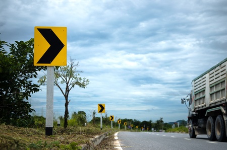 Curve winding road sign yellow for more carefully to drive the car and vehicle.