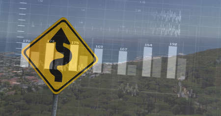 Image of financial data processing over road sign and landscape. global finance, business and digital interface concept digitally generated image.