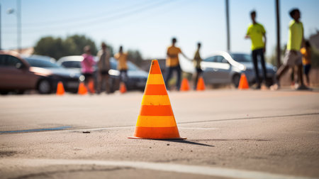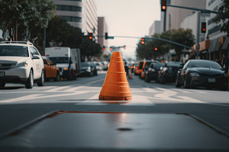 traffic cone in the middle of busy intersection, with cars zooming past, created with generative ai