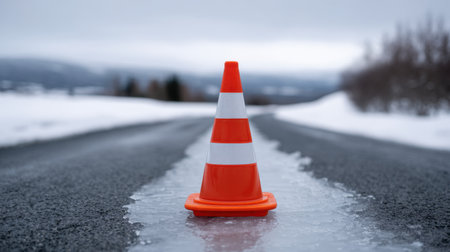 A solitary orange traffic cone stands prominently on an icy road, framed by a snowy landscape and a moody overcast sky, emphasizing winter safety.