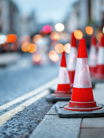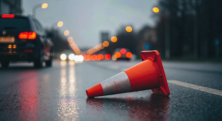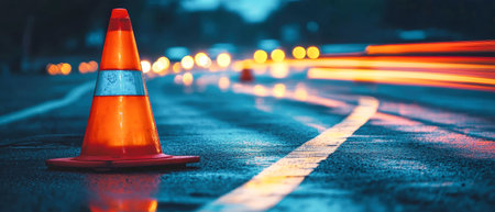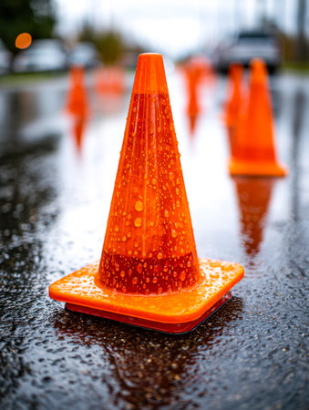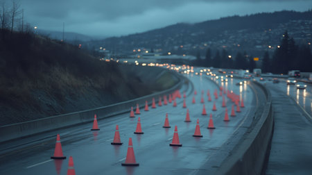 A scene depicting vibrant orange traffic cones lined up along a wet highway during a rainy evening, signaling a road block. The blurred city lights and gloomy weather create a dramatic yet atmospheric setting for traffic management.