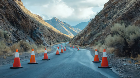 A closed mountain road is marked with bright traffic cones, creating an intriguing scene in a rugged landscape under a dynamic sky.