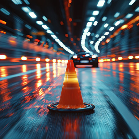 A vibrant traffic cone in a tunnel, with a blurred car creating a dynamic and futuristic vibe.
