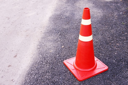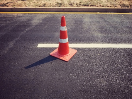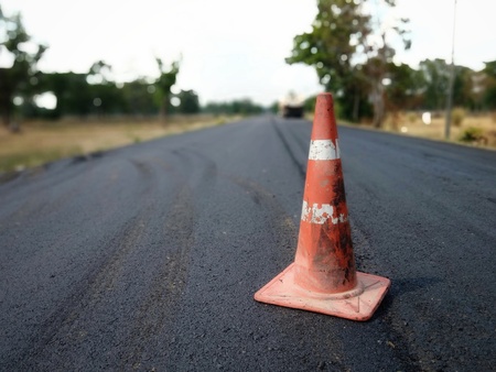 The road is currently under construction and has not yet hit the traffic line and there is a red rubber cone on the road as the front.