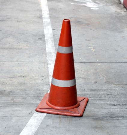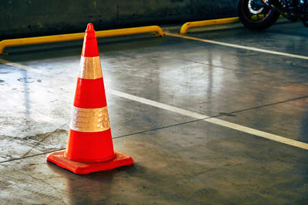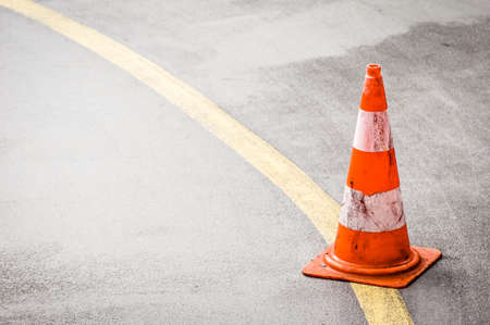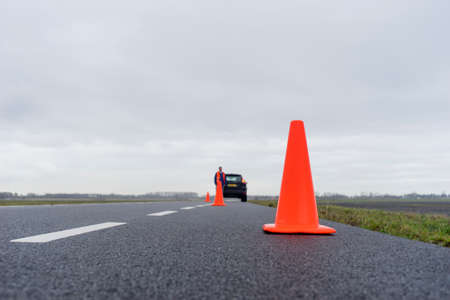 The orange cap stands on the asphalt. Warning sign on the highway. Emergency symbol. Carefully slippery road.