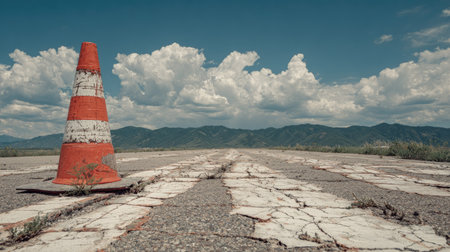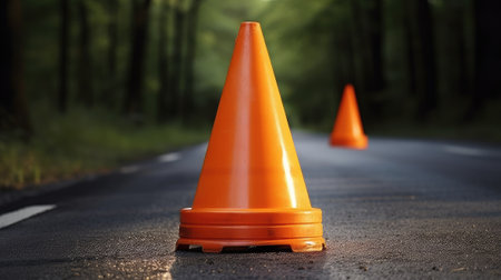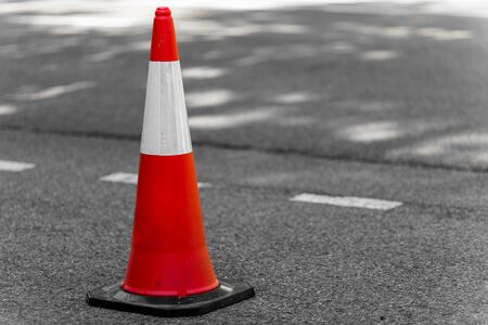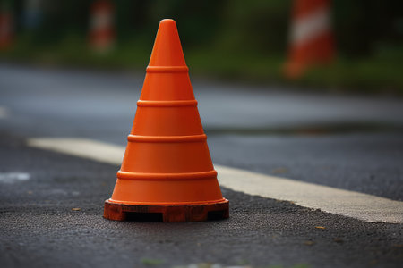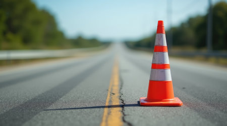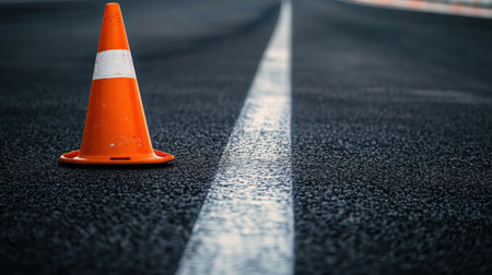 A vibrant orange traffic cone stands on a smooth black asphalt road, highlighting a white line and emphasizing concepts of road safety and caution in urban environments.