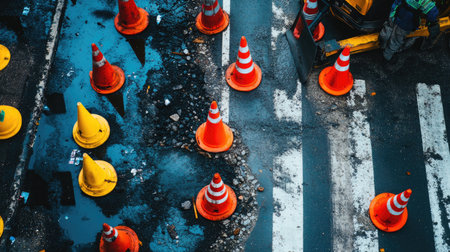 A vibrant image of traffic cones placed strategically around a pothole patching site, with construction workers in action, representing the efforts to keep urban roads safe and functional.