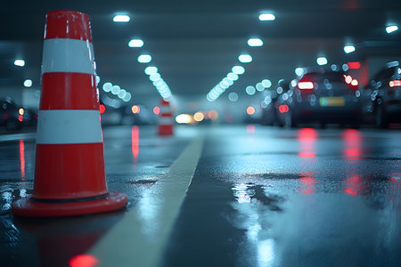 Urban parking lot scene at night featuring a close-up of an orange traffic cone on a wet surface with blurred car lights in the background, a rainy evening ambiance and city infrastructure. Generative AI