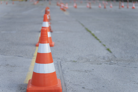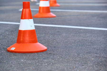 Traffic cones in driving school. Concept driving courses or driving licence training. Close up.