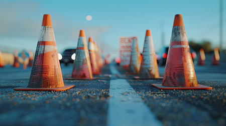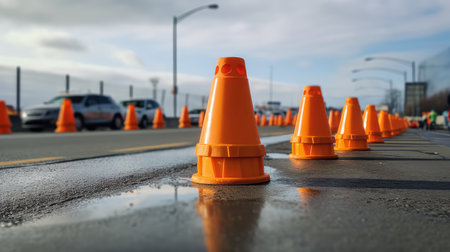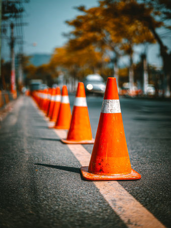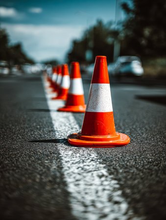 Vibrant orange and white safety cones stretch along a smooth asphalt lane, signaling caution amid daylight and clear weather, perfect for roadwork or