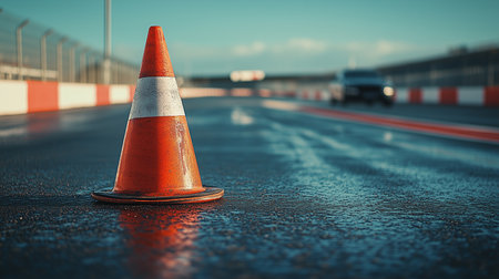 A vibrant orange traffic cone stands alone on a racetrack at sunset, casting a striking silhouette against a smooth asphalt surface, capturing a moment of tranquility and focus.