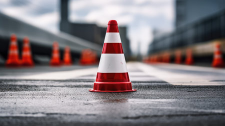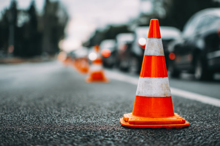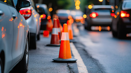 traffic cones in a row on a busy street with traffic streaming past, created with generative ai