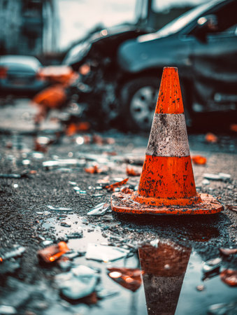 Bent and shattered orange cone lying amidst scattered debris, conveying the chaos and consequences of a recent mishap in a busy city parking area.