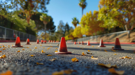 Arrangement of Traffic Cones on a Park Pathway Surrounded by Autumn Foliage Under Clear Blue Sky. Generative AI