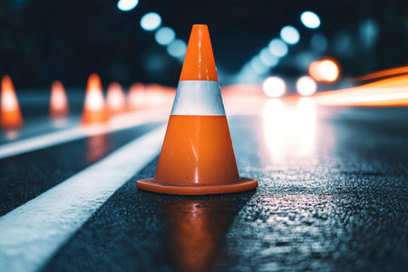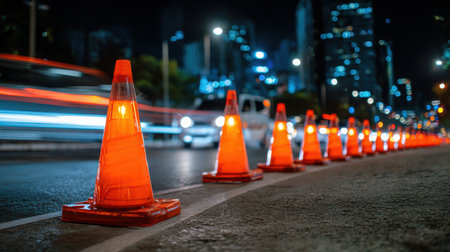 Traffic cones on road at night with blurred city lights in background creating urban scene of construction and caution in metropolitan environment