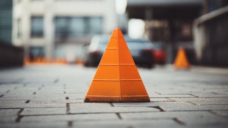 A bright orange traffic cone sits on an urban pavement, casting a distinct shadow. This image symbolizes road safety and construction management in a bustling city environment.