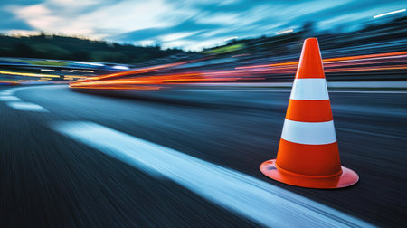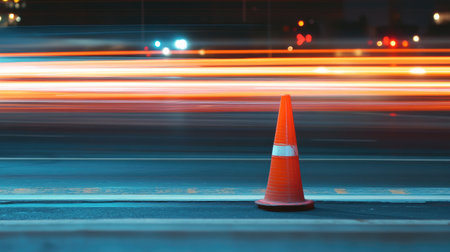 Brightly colored traffic cones stand firm on a quiet road, surrounded by the blurred trails of passing car lights as dusk settles in, creating a captivating contrast.