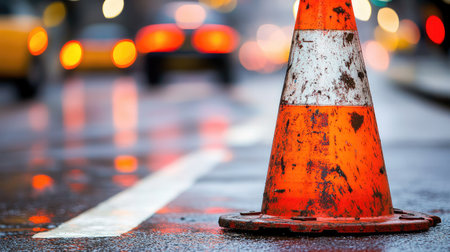 Close-up of a traffic cone with scuff marks and dirt, standing on a busy street with blurred car lights in the background. --chaos