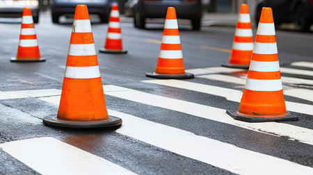Macro shot of road traffic cones with orange and white stripes standing on street on gray asphalt during road construction works. Just painted white street lines on pedestrian crossing
