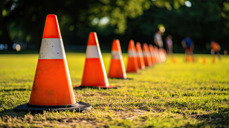 Traffic cones placed along the edge of a sports field, marking the boundary line, with players practicing in the background. --chaos