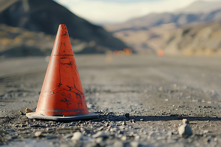 cone-filled parking lot with view of majestic mountain range in the background, created with generative ai