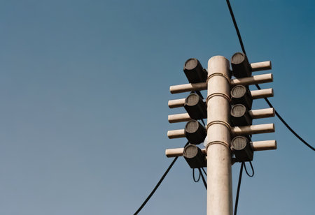 Urban traffic signal isolated against clear blue sky, minimal aesthetic, strong geometry and clean lines, no people or signage