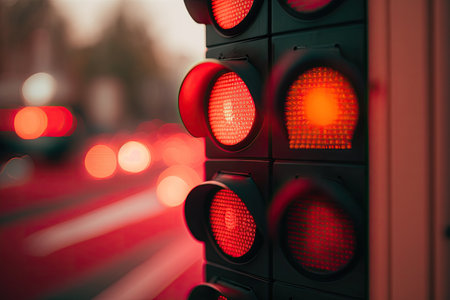 close-up of red traffic light, with the view in the background blurred and unclear, created with generative ai