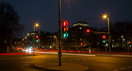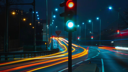 Captivating view of colorful traffic lights at a busy city intersection at night. Motion blur captures the vibrant energy of urban transportation.