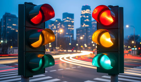A detailed image of a traffic light shows both red and green illuminated signals. The composition focuses on the lights against a dark background, highlighting the contrast. The visual style features clear, modern aesthetics, and the image may be used in commercial projects or editorial content.