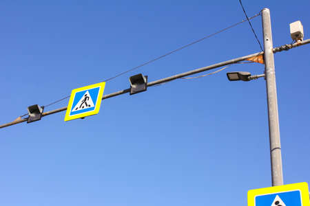 Street pole with traffic lights and road signs against the blue sky