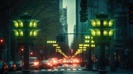 A charming image of a row of traffic lights on a busy street, showcasing their colorful signals and the rhythm of city life in motion