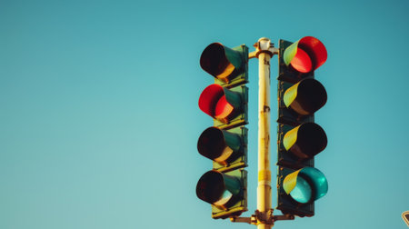 A vibrant traffic light displaying red, yellow, and green against a clear blue sky, symbolizing control and safety in urban environments. Ideal for transportation themes.