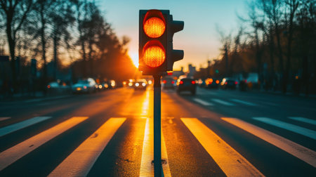 A striking image of a red traffic light at sunset, illuminating an urban street crossing. The scene captures the essence of city life with vehicles and a stunning evening backdrop.