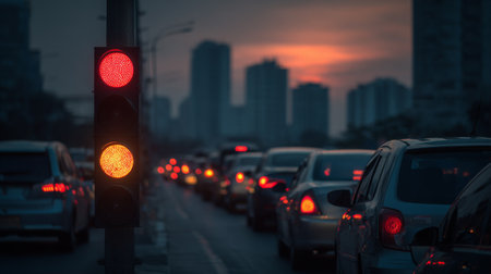 A busy urban traffic scene showcases cars halted at a red light during an evening sunset, with silhouettes of buildings enhancing the city