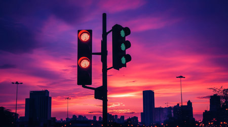 A dramatic shot of a traffic light silhouetted against a colorful sunset, emphasizing the transition from day to night in a vibrant cityscape