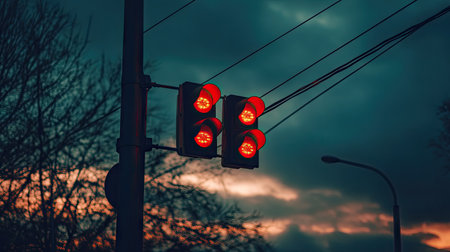 Traffic lights dangling on wires, illuminated red against a moody twilight sky with fading daylight