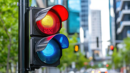 Countdown to 2026: stylized traffic light with year labels replaces traditional signals, downtown setting