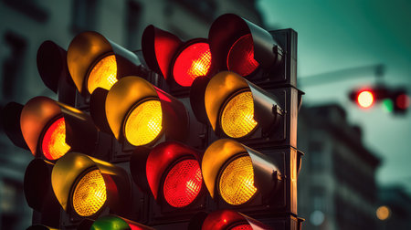 A close-up view presents a traffic signal displaying red, green, and yellow lights. The colors of the lights contrast against a blurred city background. The image exhibits high contrast and bokeh effects. Suitable for illustrating transportation, urban infrastructure, or safety concepts for various purposes.