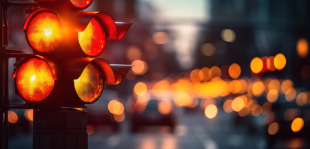 A traffic light in the evening showing the yellow light, with bokeh from distant streetlights and blurred traffic moving past, symbolizing waiting and anticipation
