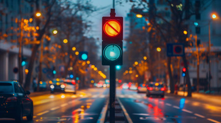 A vibrant urban traffic light displaying red, yellow, and green signals amidst a bustling city backdrop. A symbol of modern transportation and safety.